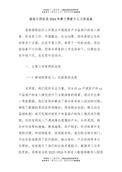 / 【2024年】驻村工作队员2024年第三季度个人工作总结材料严选、写材料写出头】